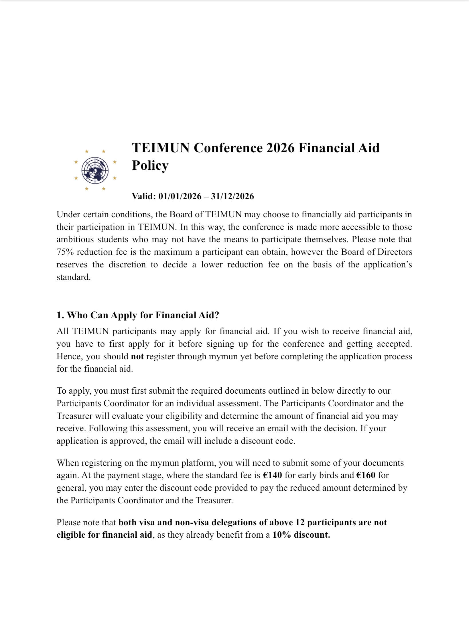 Financial Aid Policy TEIMUN Conference 2026